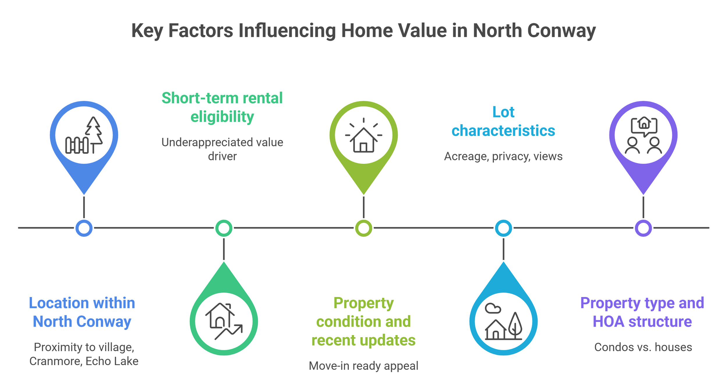 Location within North Conway. "North Conway" covers a wide geographic footprint. A property within walking distance of the village center, Cranmore Mountain, or Echo Lake State Park commands a premium. Proximity to the Saco River, mountain views, and access to hiking and ski trails all carry measurable value with the second-home buyer pool that dominates this market.